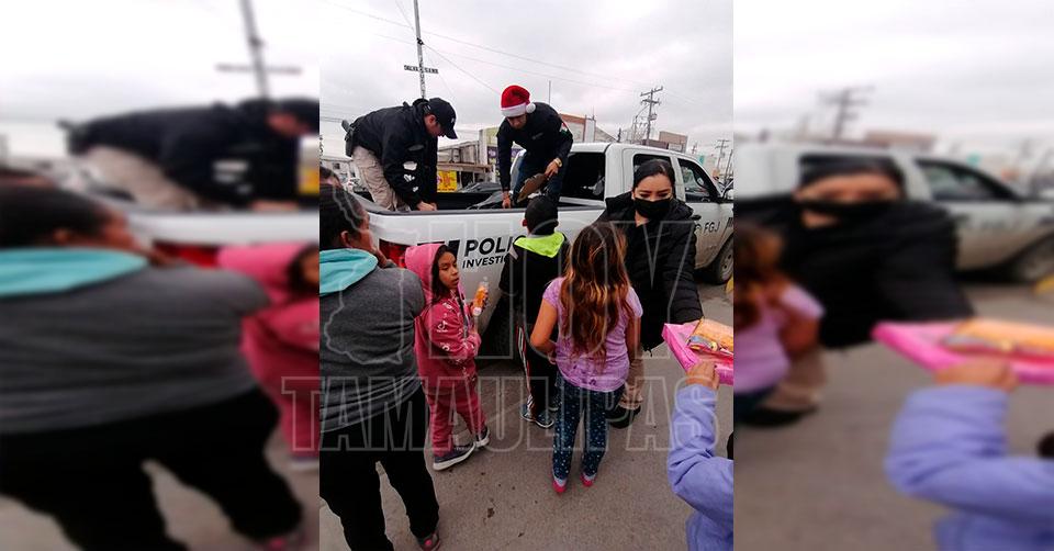 Matamoros, Tamaulipas. - Elementos de la Policía Investigadora de la Fiscalía General de Justicia (FGJ) en Matamoros se organizaron para recaudar gran cantidad de dulces, juguetes y piñatas para llevar a los niños de bajos recursos.