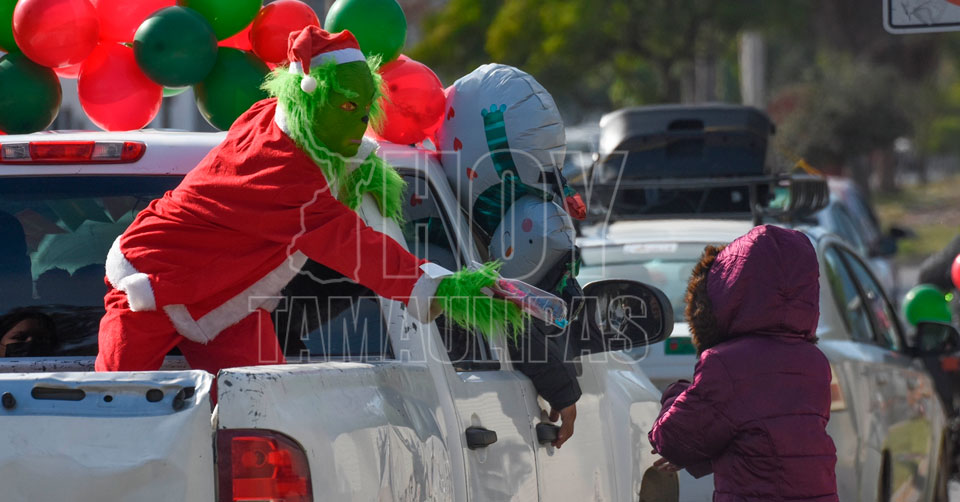 Ciudad Victoria, Tamaulipas.- Elementos de la dirección de Tránsito Victoria previo a la Nochebuena dejaron las multas a un lado y regalaron juguetes en compañía del Grinch que hoy anduvo de buen humor y cooperó con la causa.