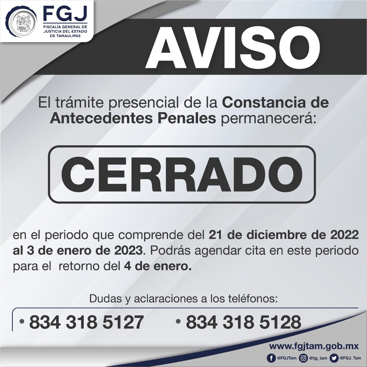 Ciudad Victoria, Tamaulipas. – El trámite de la constancia de antecedentes penales fue suspendido en la Fiscalía General de Justicia (FGJ) de Tamaulipas, debido al periodo de asueto decembrino.