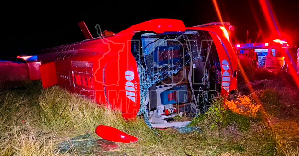 Soto La Marina, Tamaulipas. - Al menos 40 pasajeros de un autobús de la línea ADO resultaron lesionados esta madrugada, luego de volcar en el kilómetro 204 de la carretera Soto La Marina-Rayones.