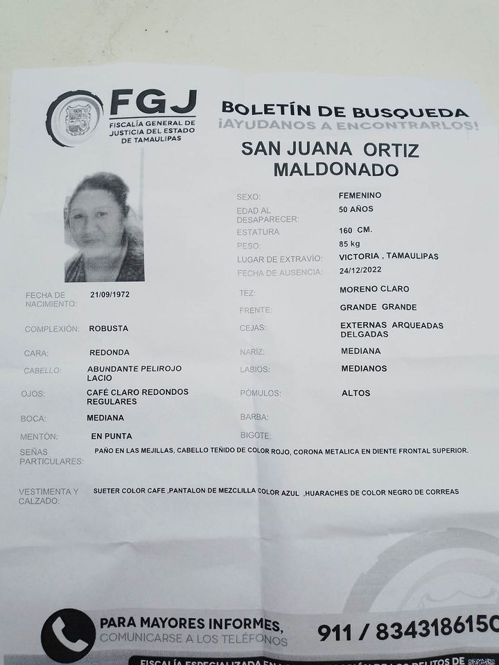 Ciudad Victoria, Tamaulipas. – La Fiscalía General de Justicia de Tamaulipas emitió un boletín de búsqueda para dar con el paradero de San Juana Ortiz Maldonado, desaparecida el pasado 24 de diciembre de 2022 en Ciudad Victoria.