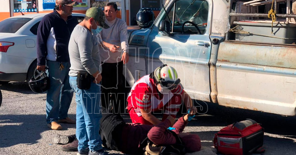 Ciudad Victoria, Tamaulipas. - Con probable fractura en su pierna derecha resultó un repartidor de Domino's Pizza al caer de la motocicleta que tripulaba al percatarse que el conductor de una camioneta de modelo antiguo se iba a pasar un alto.