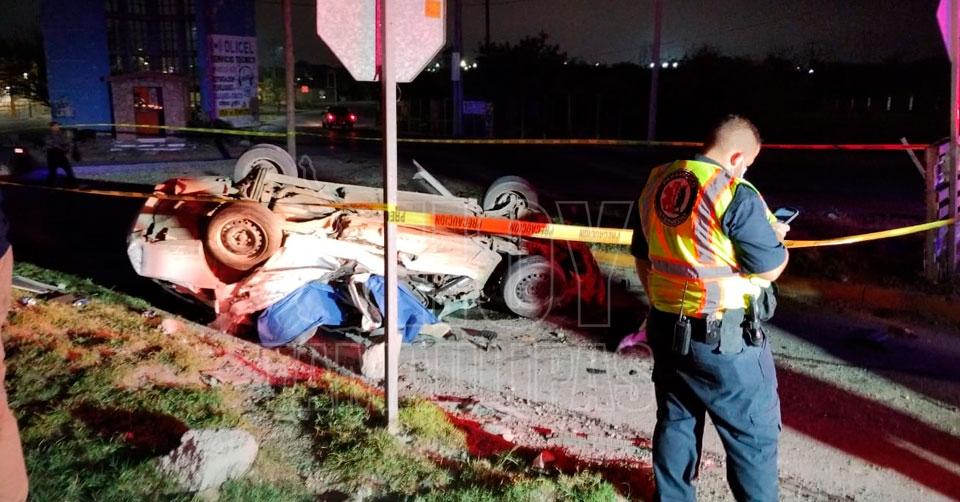 Posteriormente se reportó la muerte de cuatro personas que quedaron prensadas dentro de un vehículo Chevrolet Cobalt que se impactó contra un autobús y terminó volcado sobre la carretera a Monterrey, a la altura de la colonia Bugambilias en Reynosa.