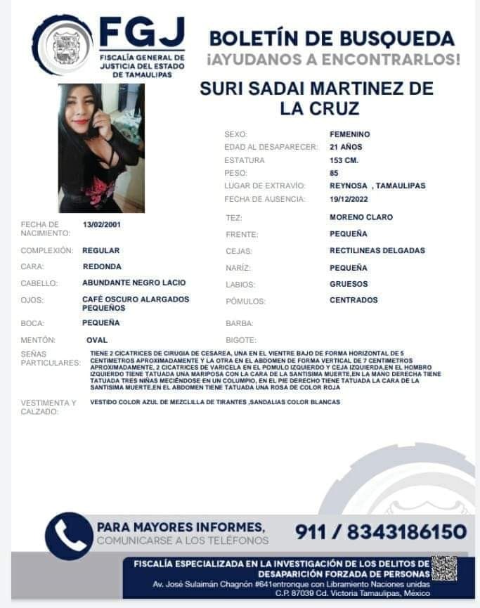 Reynosa, Tamaulipas. - La joven Suri Sadai Martinez de La Cruz desapareció el pasado 19 de diciembre en Reynosa, su familia pide ayuda para localizarla pues temen por su integridad física.