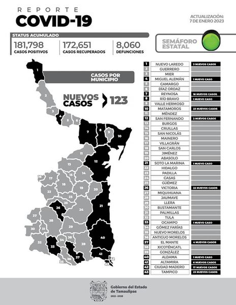 Ciudad Victoria, Tamaulipas. - Un total de 123 nuevos contagios de Covid-19 se reportaron este sábado en Tamaulipas, sin ninguna muerte por complicaciones graves de la enfermedad, confirmó la Secretaría de Salud del Estado.