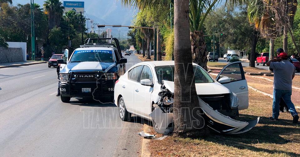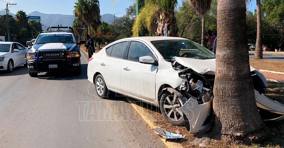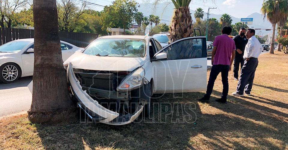 Ciudad Victoria, Tamaulipas. – Un conductor convirtió su automóvil en chatarra esta tarde luego de estrellarse contra una palmera, presuntamente por que otro automovilista le dio un cerrón y perdió el control al volante.