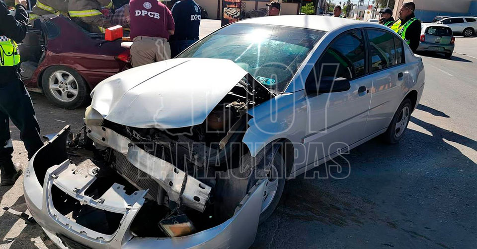 Nuevo Laredo, Tamaulipas.— Una joven de 20 años quedó lesionada y atrapada dentro de un automóvil, luego de registrarse un aparatoso encontronazo en un crucero de la colonia Guerrero, provocado por un menor de edad, a quien acompañaba y se cruzó un semáforo en luz roja.