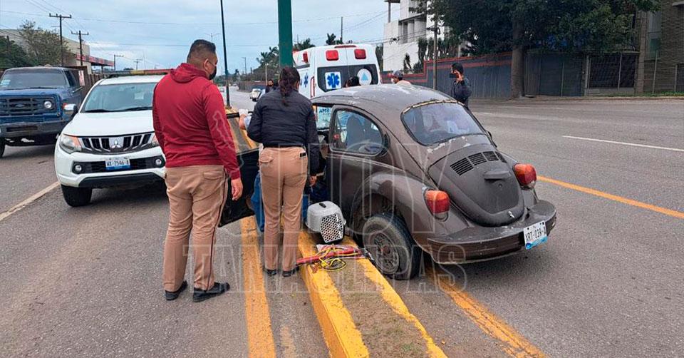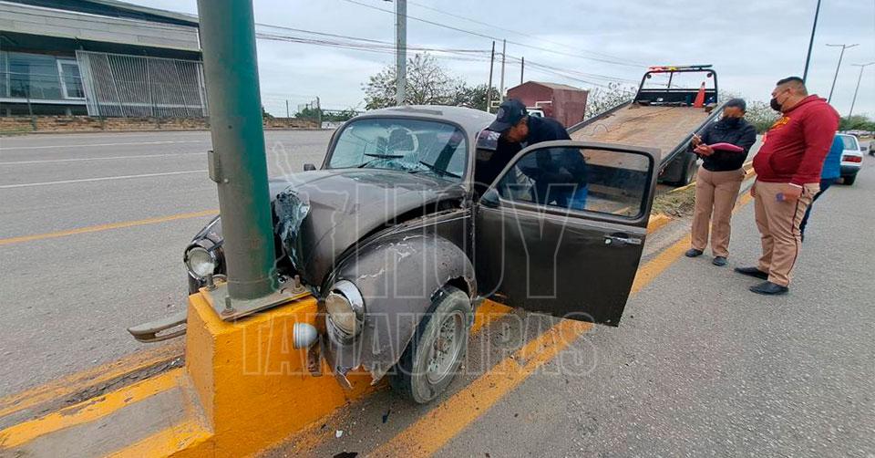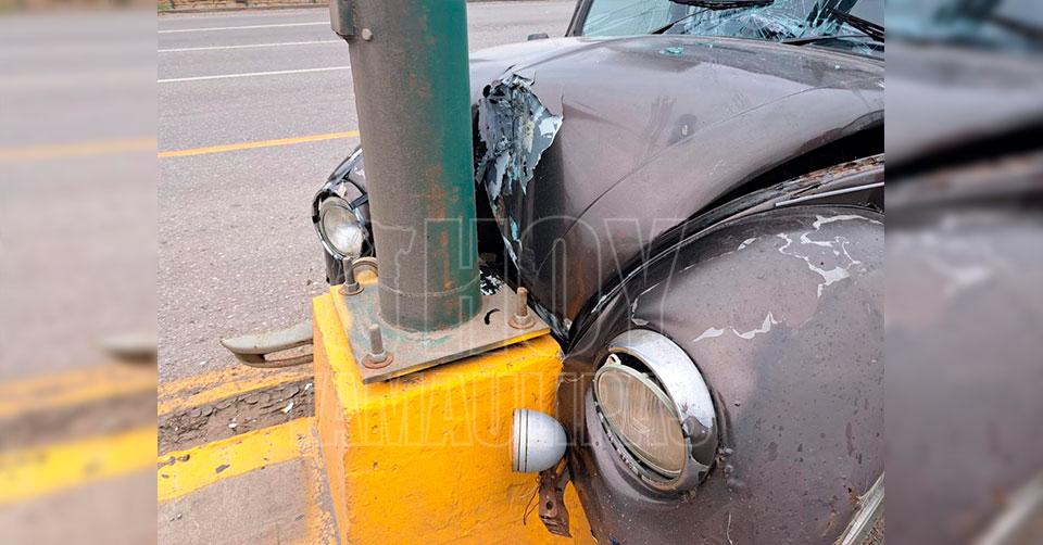 Altamira, Tamaulipas. - Debido a una aparente falla mecánica, el conductor de un "vochito" perdió el control del volante y se proyectó contra la base de un poste del servicio de alumbrado público, resultando con algunas lesiones.
