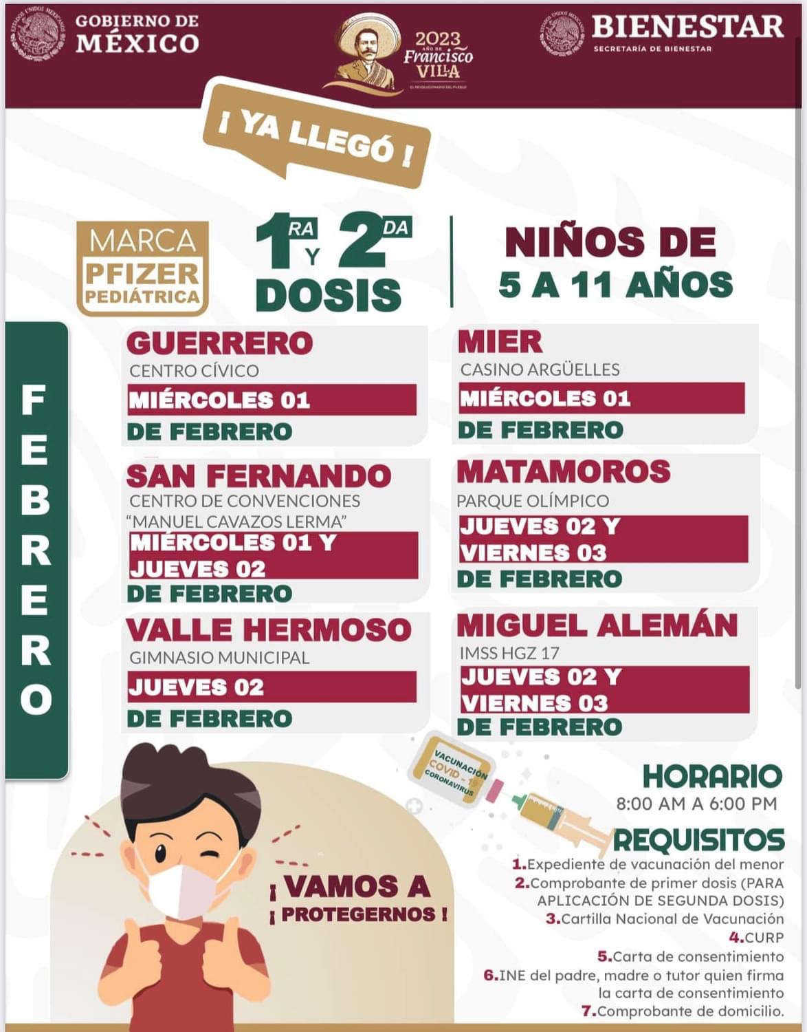 Matamoros, Tamaulipas. - El día 2 y 3 de febrero se estará aplicando el biológico Pfizer contra el Covid-19 a los niños de 5 a 11 años de edad en las instalaciones del Parque Olímpico en Matamoros, en un horario de 8:00 de la mañana a 6:00 de la tarde.