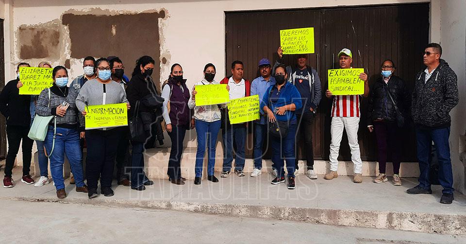 Los trabajadores mostraron cartulinas donde expresaron: "Queremos saber los avances y 'logros' del Sindicato", "Exigimos asamblea sindical", "Información de ingresos y egresos", "Suetra es de todos", "Los compañeros exigimos junta sindical, informe qué 'avances' hay", y "Elizabeth Juárez Merinos ¿la junta para cuándo?".