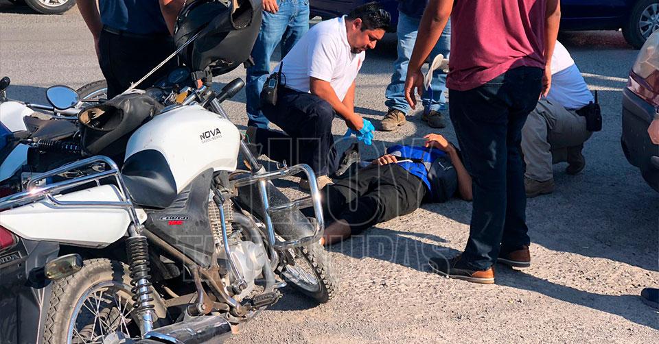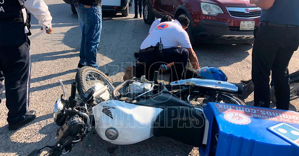 Ciudad Victoria, Tamaulipas. - Un empleado de Domino's Pizza fue llevado al Seguro Social donde quedó internado al sufrir diversos golpes en todo el cuerpo, luego de chocar la motocicleta que tripulaba contra una camioneta que le cerró el paso; la conductora intentó darse a la fuga y en esos momentos un repartidor de Rappi se le atravesó para evitarlo.
