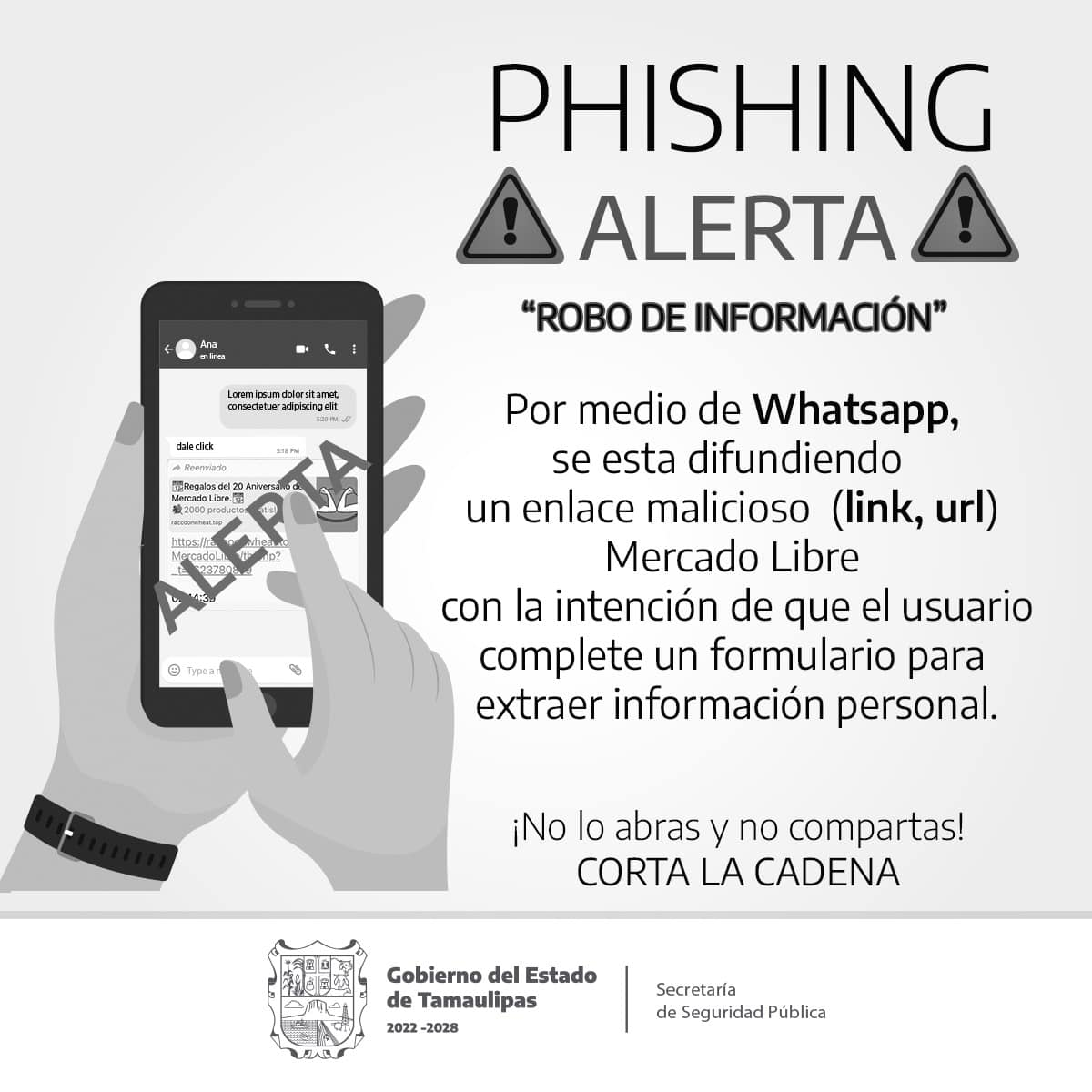 "No abras los enlaces que envían a tu WhatsApp ofreciendo promociones increíbles. Puede ser un Hacker que intenta robar tu información para usarla en tu contra, incluso para extorsionarte", advierte el comunicado.