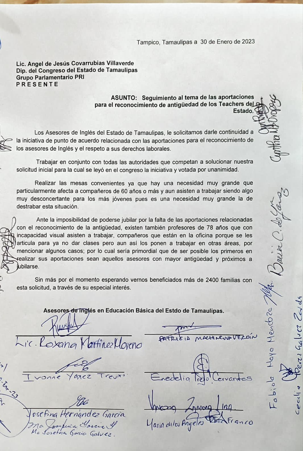 "Los asesores de inglés le solicitamos darle continuidad a la iniciativa de punto de acuerdo, relacionada con las aportaciones para el reconocimiento de los asesores de inglés y el respeto a sus derechos laborales.