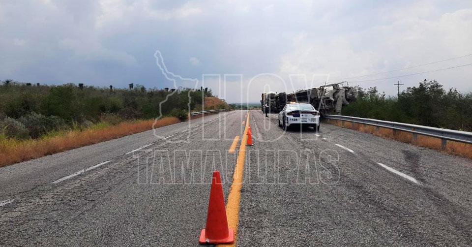 Ciudad Victoria, Tamaulipas. - Derivado de la volcadura de un tractocamión sobre la barrera de contención en la carretera Rayones-Soto la Marina, la circulación se encuentra cerrada en un carril.