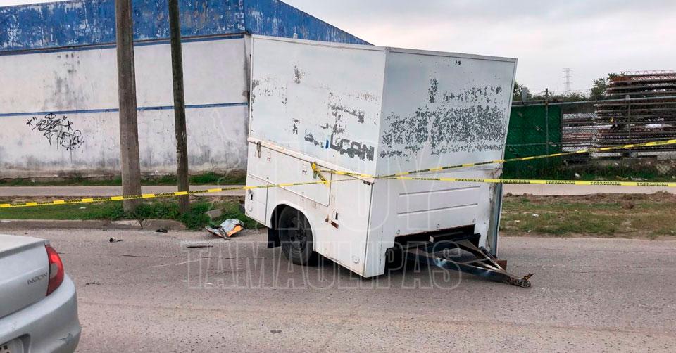 Altamira, Tamaulipas. - El destino le jugó en contra al pasajero de un taxi, quien aparentemente regresaba a su domicilio después de cumplir con su jornada laboral y perdió la vida debido a que la unidad de transporte se impactó contra el remolque que se le zafó a un camión.