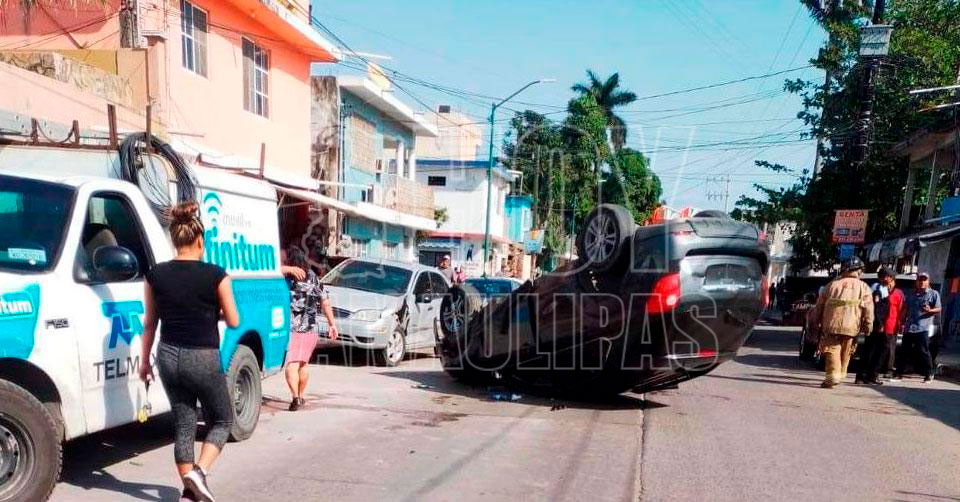 Tampico, Tamaulipas. – Una aparatosa volcadura de un vehículo se registró la tarde de este lunes en calles de la colonia Morelos en Tampico, unidad que previamente se impactó con un automóvil estacionado.