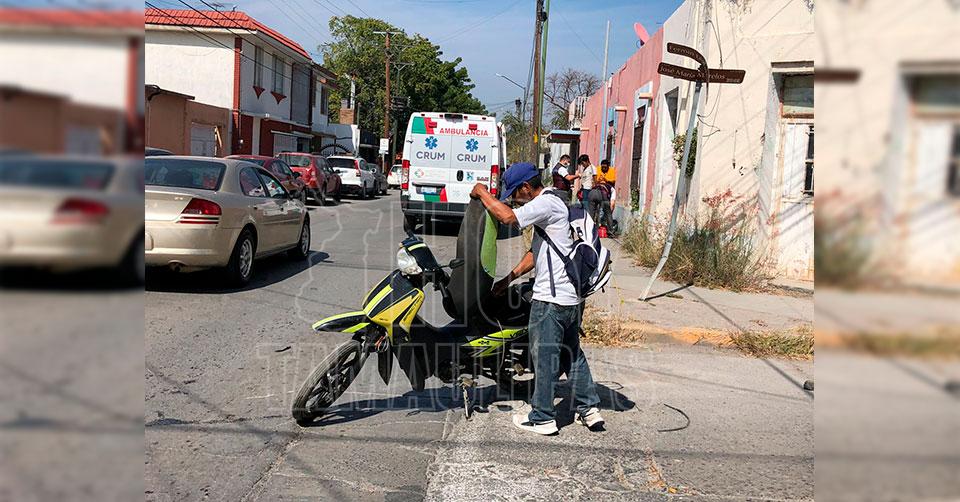 Ciudad Victoria, Tamaulipas. – Un joven motociclista resultó con lesiones menores al chocar con otro motociclista en el 21 Morelos en Ciudad Victoria, lugar al que llegaron paramédicos del Centro Regulador de Emergencias (CRUM).