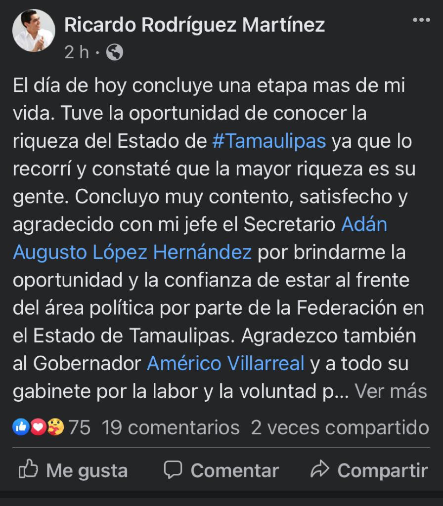 "El día de hoy concluye una etapa más de mi vida. Tuve la oportunidad de conocer la riqueza del Estado de Tamaulipas ya que lo recorrí y constaté que la mayor riqueza es su gente. Concluyo muy contento, satisfecho y agradecido con mi jefe el secretario Adán Augusto López Hernández por brindarme la oportunidad y la confianza de estar al frente del área política por parte de la Federación en el Estado de Tamaulipas".