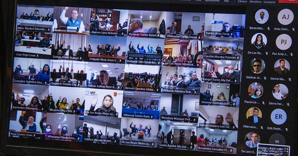 La reunión se desarrolló en modo virtual y se trasmitió desde la sala de juntas de la Rectoría, con la asistencia presencial del C. P. Guillermo Mendoza Cavazos, rector de la UAT, como presidente de la Asamblea Universitaria, acompañado del Dr. Eduardo Arvizu Sánchez, secretario general, y del C. P. Luis Navarro Roso, decano de la Universidad.