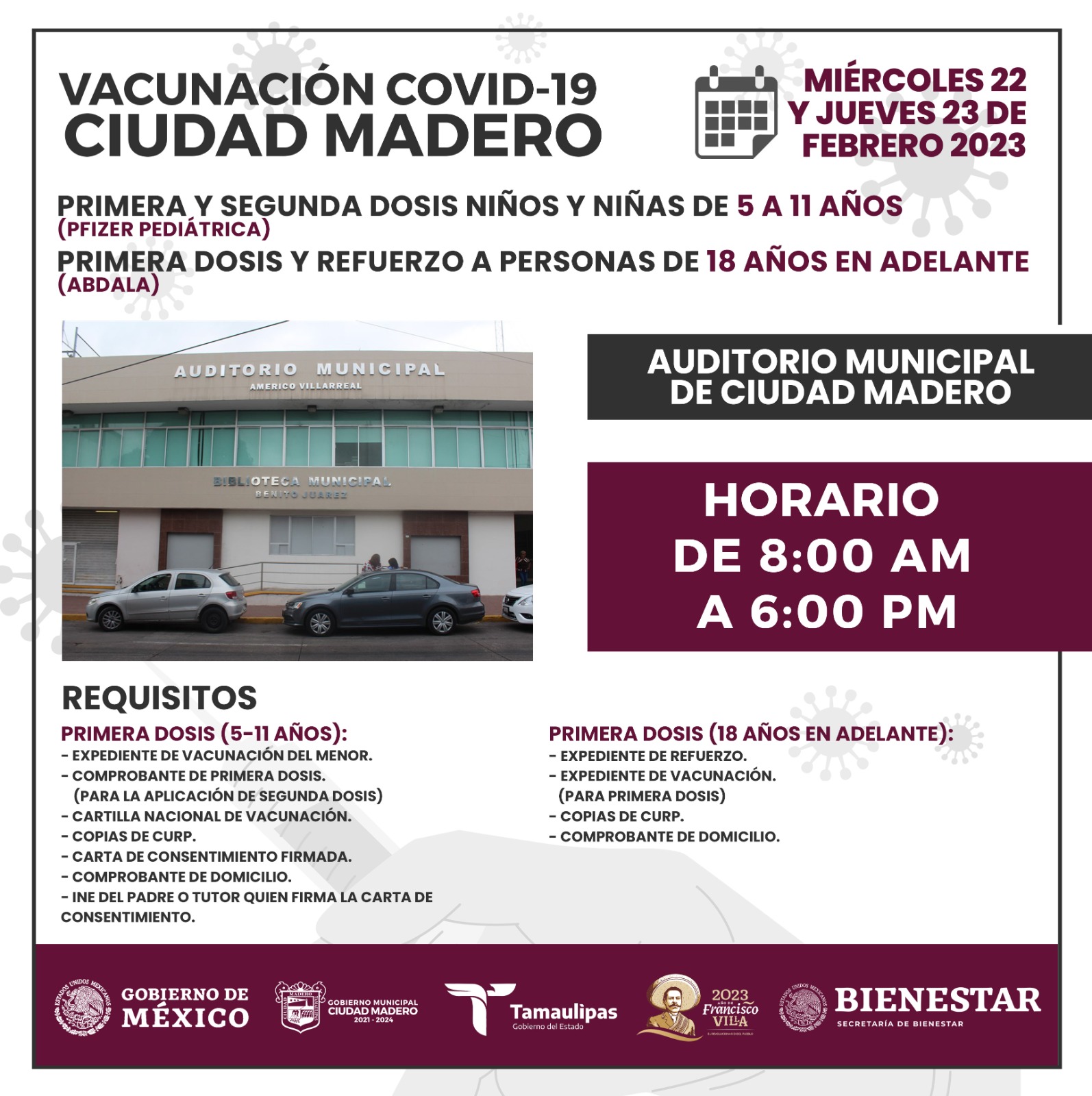 Ciudad Madero, Tamaulipas. - La directora de Municipio Saludable en Madero, Tatiana Ojeda Caballero, informó que este miércoles 22 y jueves 23 de febrero se llevará a cabo la jornada de inmunización para la primera y segunda dosis a niños de 5 a 11 años de edad con Pfizer y refuerzo para jóvenes mayores de 18 años con la vacuna cubana Abdala.