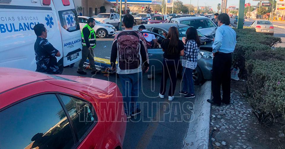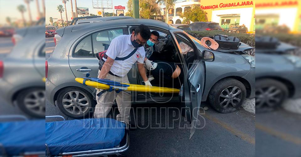 Ciudad Victoria, Tamaulipas. – Una mujer resultó gravemente lesionada e inconsciente luego de terminar en el asiento trasero del auto que conducía, tras salir eyectada del asiento al ser impactada por una camioneta en el 8 Zacatecas en Ciudad Victoria.