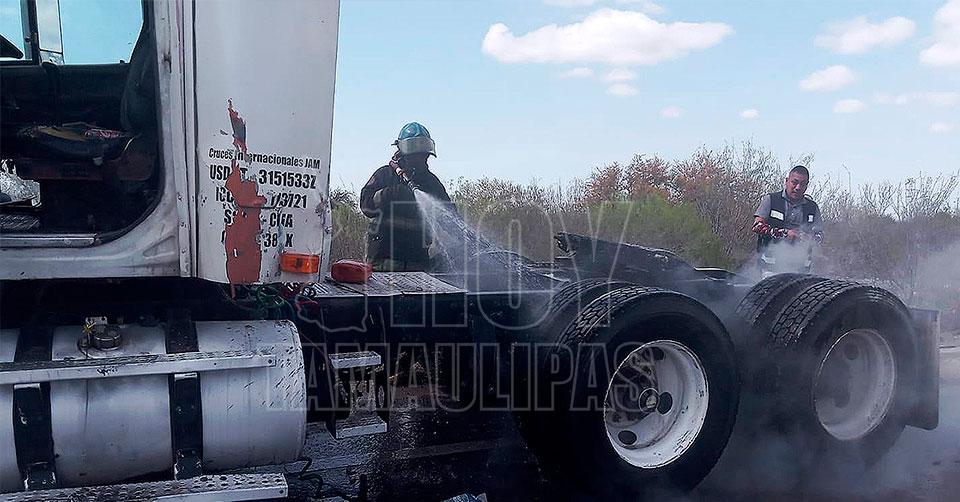 Nuevo Laredo, Tamaulipas.— Debido a la fricción constante en las balatas de la unidad, un tractocamión estuvo a punto de incendiarse por completo mientras su operador viajaba sobre el Segundo Anillo Periférico en Nuevo Laredo.