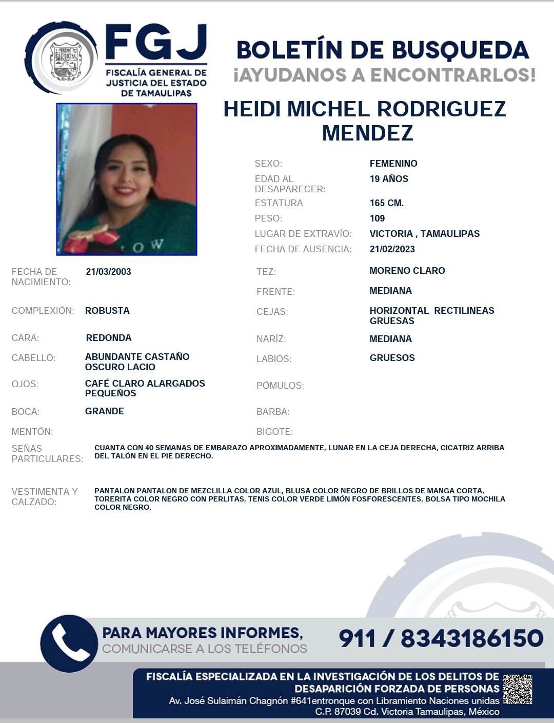 Ciudad Victoria, Tamaulipas. – La Fiscalía General de Justicia del Estado de Tamaulipas (FGJT) emitió un boletín de búsqueda para dar con el paradero de Heidi Michel Rodríguez Méndez.