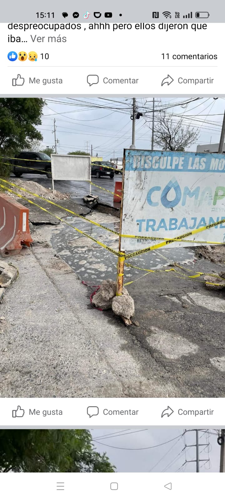 "Media ciudad o más colapsada por falta de suministro de agua potable por más de 48hrs y mientras tanto esta fuga de agua y obra que si no me equivoco tiene años y lo disque arregla. desde gobiernos antes durante de Maki Ortiz y ahora si hijo Carlos peña y su inútil administración de la Comapa Reynosa despreocupados, ahhh pero ellos dijeron que iban a ser diferentes, pónganse a jalar no es posible tanta mediocridad e indolencia de su parte", escribió un usuario al reportar la fuga de agua.