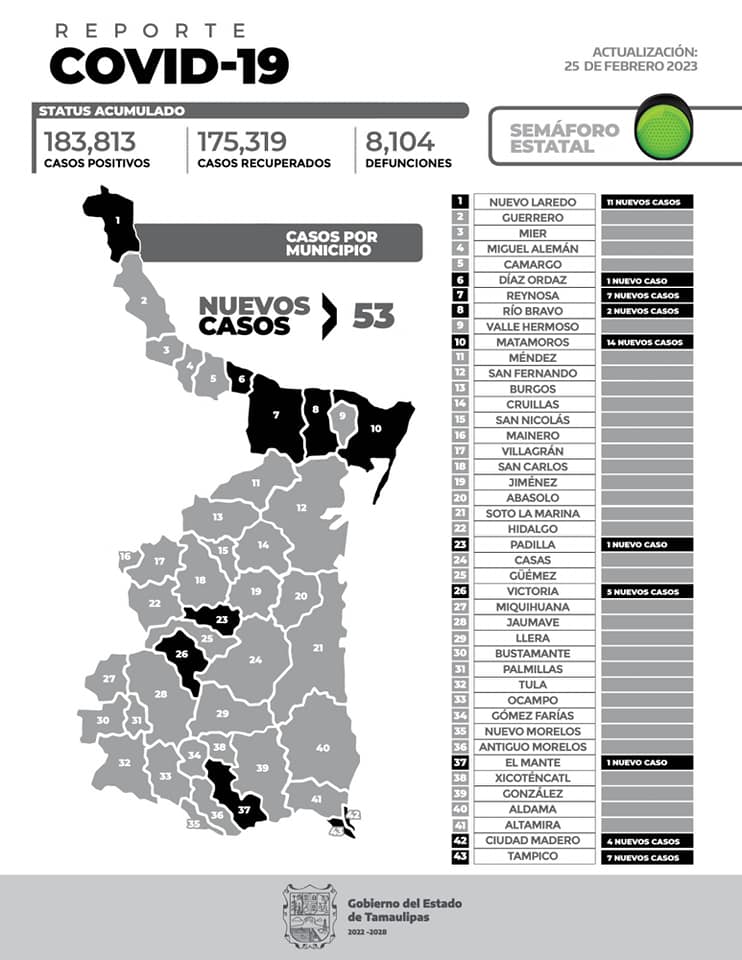 Ciudad Victoria, Tamaulipas.- Un total de 53 nuevos contagios de Covid-19 sin ninguna muerte por complicaciones graves de la enfermedad se reportaron este sábado en Tamaulipas, informó la Secretaría de Salud del Estado.
