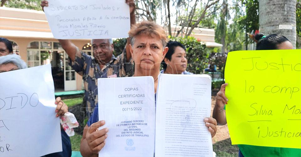 También se vio obligada a obtener una orden de restricción en contra del abogado Sergio "N", porque presuntamente la amenazó el sábado pasado cuando la visitó en su domicilio, por tanto teme por su vida por este proceder violento del profesionista, viéndose empujada en su desesperación a pedir apoyo a los integrantes de la Unión de Jubilados y Pensionados del Ayuntamiento de Tampico para realizar la denuncia pública frente al Palacio Municipal.