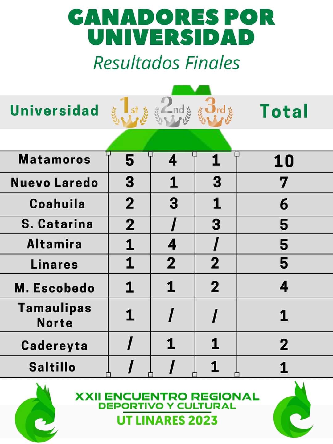 Matamoros, Tamaulipas.- En rueda de prensa y ante la presencia de los mismos campeones, la rectora de la Universidad Tecnológica de Matamoros, Diana Masso Quintana, dió a conocer el gran logro que obtuvieron los estudiantes de la UTM mediante el XXII Encuentro Regional Deportivo y Cultural de Universidades Tecnológicas Linares 2023, donde inclusive obtuvieron el primer lugar de éste torneo, pues se adjudicaron cinco primeros lugares, cuatro segundos y un tercer lugar, siendo la mejor delegación de todos los participantes.
