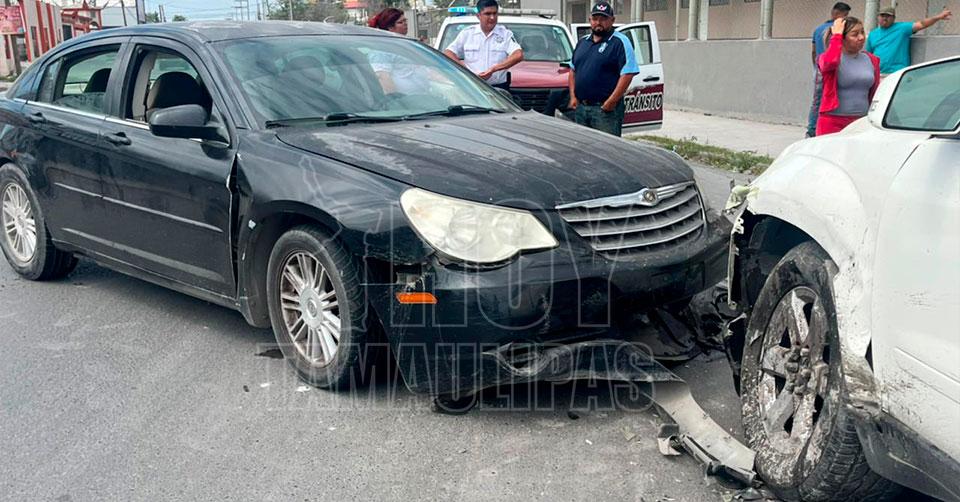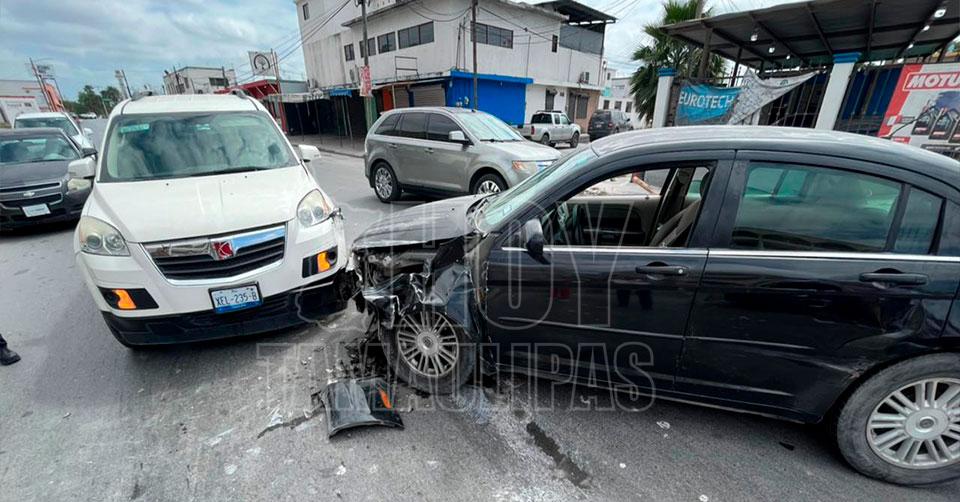 Matamoros, Tamaulipas. - Un fuerte choque entre un auto y una camioneta ocurrió en la Avenida Solidaridad, que únicamente dejó daños materiales.