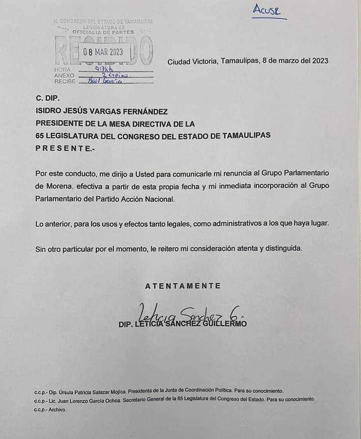 Ciudad Victoria, Tamaulipas. - La diputada Leticia Sánchez Guillermo presentó esta mañana su renuncia al grupo parlamentario del Movimiento de Regeneración Nacional (Morena), y asimismo solicitó su incorporación a la de Acción Nacional (PAN).
