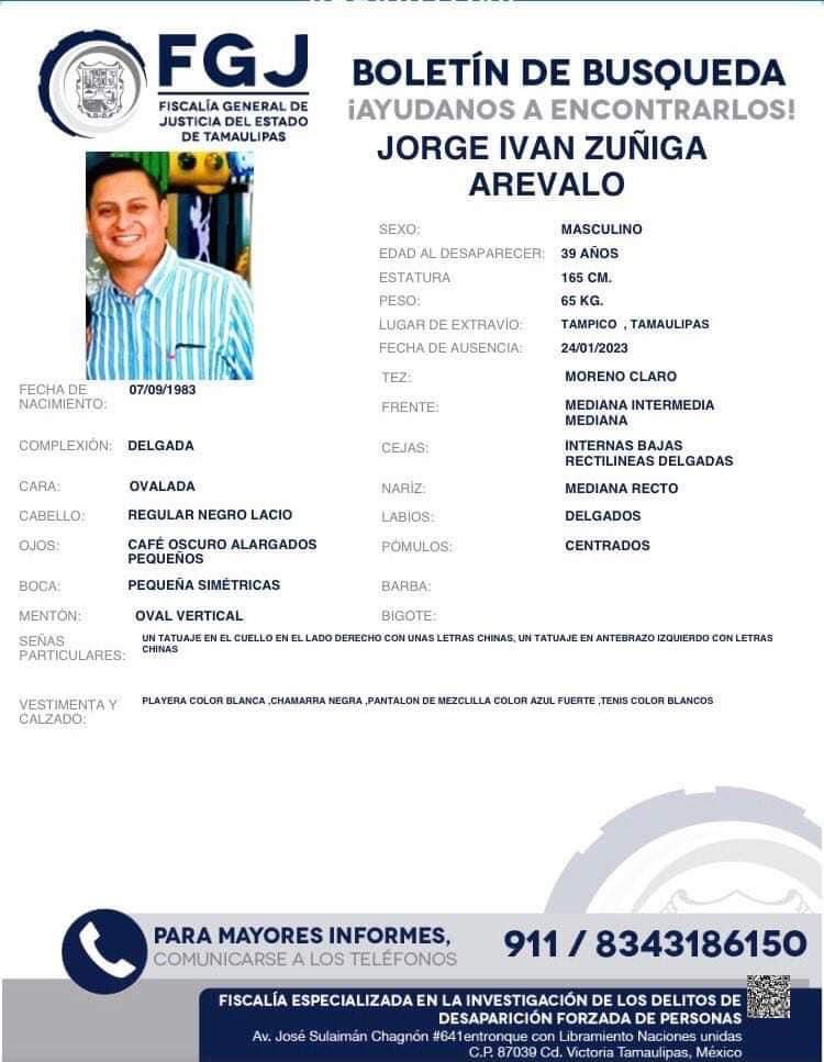 Tampico, Tamaulipas. – La Fiscalía General de Justicia del Estado de Tamaulipas (FGJT) informó la desaparición de Jorge Iván Zúñiga Arévalo, quien fue visto por última vez en Tampico, Tamaulipas.