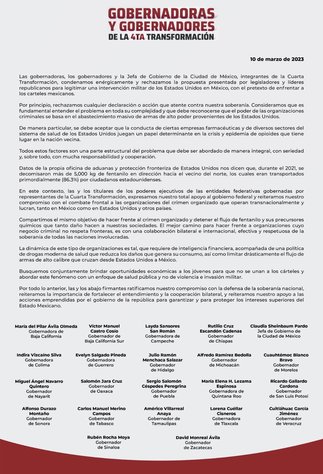 Ciudad Victoria, Tamaulipas. - A través de un desplegado, gobernadoras, gobernadores y la jefa de Gobierno de la Ciudad de México, integrantes de Movimiento de Regeneración Nacional (Morena), entre ellos el tamaulipeco Américo Villarreal Anaya, condenaron enérgicamente y rechazaron la propuesta presentada por legisladores y legisladoras Republicanos para legitimar una invasión militar de Estados Unidos a México.