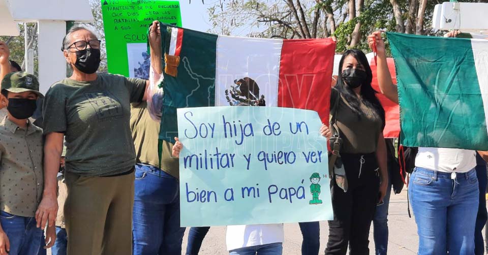 Enseguida, expresaron a un solo coro "¡libertad!", "¡libertad!", "¡libertad!", "¡apoyo total a nuestros militares, estamos con ellos!", y "¡justicia!", "¡justicia!", "¡justicia!", al momento que ondeaban las banderas de México y levantaban las cartulinas, entre las que destacaba una con la leyenda: "soy hija de un militar y quiero ver bien a mi papá".