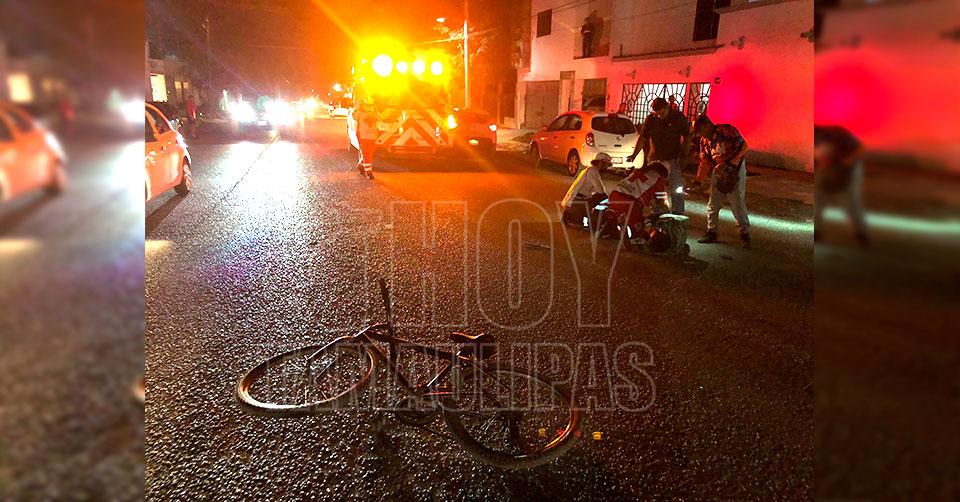 Ciudad Victoria, Tamaulipas. - Un ebrio ciclista resultó con una pierna fracturada cuando al intentar cruzar la calle Matamoros en Ciudad Victoria sin hacer el alto correspondiente, fue atropellado por un vehículo.