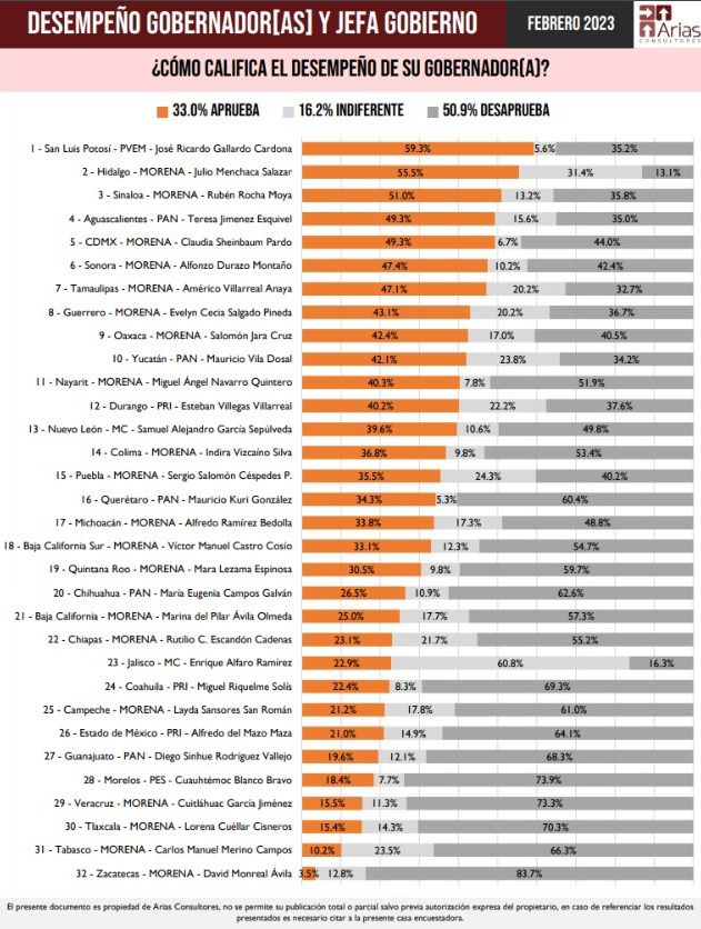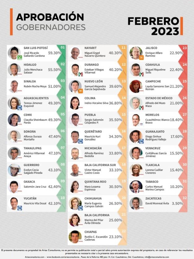 La encuesta realizada en febrero del 2023 detalla que Villarreal Anaya ocupó el lugar número siete de los 32 gobernadores de México.