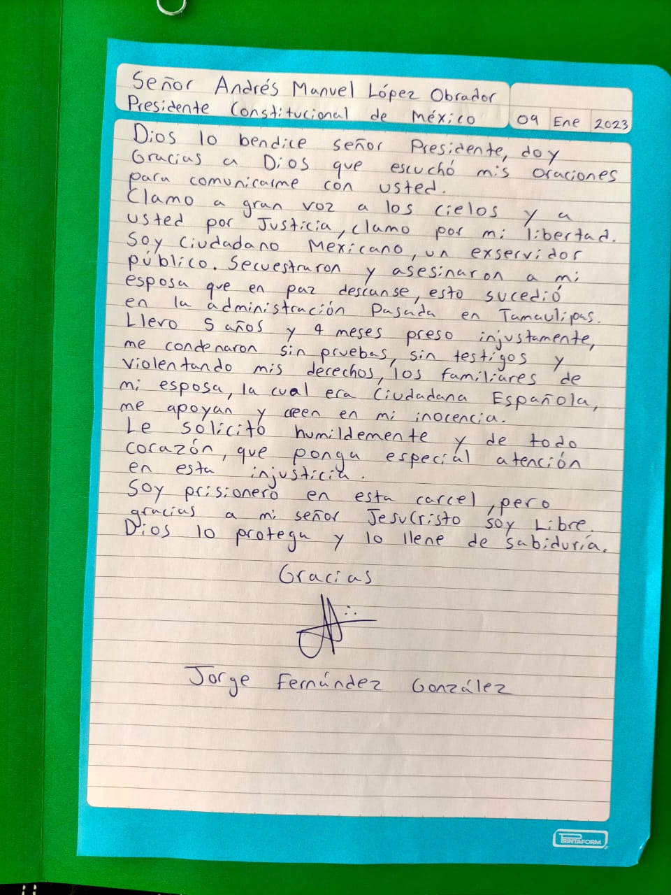 Le solicito humildemente y de todo corazón que ponga atención en esta injusticia. Soy prisionero en esta cárcel pero gracias a mi señor Jesucristo soy libre. Dios lo proteja y lo llene de sabiduría".