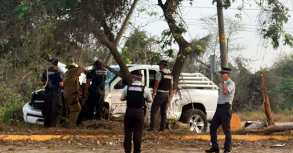 Al lugar se movilizaron Bomberos Voluntarios de Tamaulipas y elementos de la Guardia Nacional para tomar conocimiento del percance, iniciando trabajo con equipo hidráulico para liberar la camioneta que quedó prensada contra el poste.