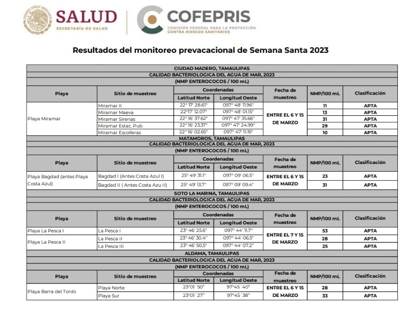 "Recibimos el reporte de los resultados del monitoreo pre vacacional de semana santa 2023 que realizó la Cofepris a las playas de Miramar en Madero; Bagdad de Matamoros; La Pesca en Soto la Marina y Barra del Tordo en Aldama, las cuáles salieron muy por debajo de lo permitido en lo que se refiere calidad bacteriológica del agua de mar".
