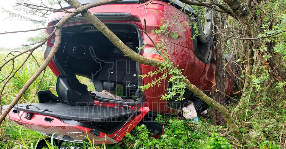 Viajaban a bordo de una camioneta Jeep Grand Cherokee guinda, la cual quedó entre el monte con las llantas al cielo, luego de que el conductor perdió el control al volante.