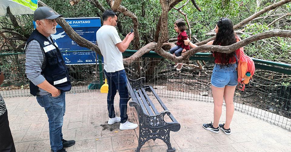 "Les comentaba a los papás que no suban a los niños al árbol o al barandal porque es peligroso, y aparte la rama de ese mangle está ya vencida, entonces hay riesgo de que se caiga o que se lastimen los niños, no acercarse tanto a la valla ni subir a los niños ahí, es peligroso, puede sobrevenir un coletazo de los animales", comentó el trabajador del municipio en función de vigilancia, Martín Padilla Castillo.