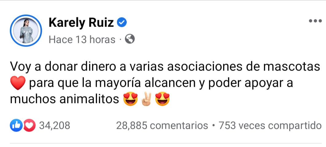 "Voy a donar dinero a varias asociaciones de mascotas para que la mayoría alcancen y podamos ayudar a muchos animalitos”, posteó Karely.