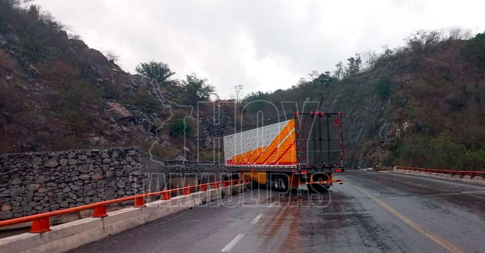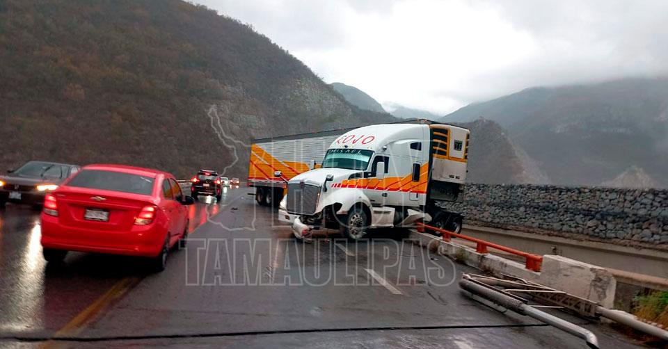 Ciudad Victoria, Tamaulipas. – Un tráiler articulado con un contenedor derrapó esta tarde y estuvo a punto de caer del puente que se ubica en el kilómetro 10 de la carretera Rumbo Nuevo.
