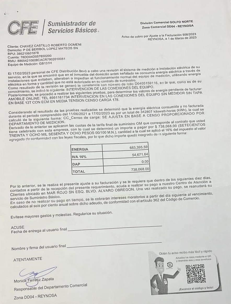 En un documento de la CFE se estipula que el adeudo es de $ 738,068.00 (SETECIENTOS TREINTA Y OCHO MIL SESENTA Y OCHO PESOS 00/100 MN,) aunque el documento está dirigido a su antiguo administrador, el adeudo corresponde al municipio de Reynosa, ya que recuperó la administración del inmueble hace aproximadamente cuatro meses.