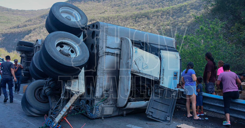Ciudad Victoria, Tamaulipas. - Tras el choque con volcadura de un automóvil y la caja de un tráiler que transportaba aguacate, mientras ciudadanos rapiñaban, elementos de la Cruz Roja Mexicana y el reportero de un medio local rescataban a los lesionados.
