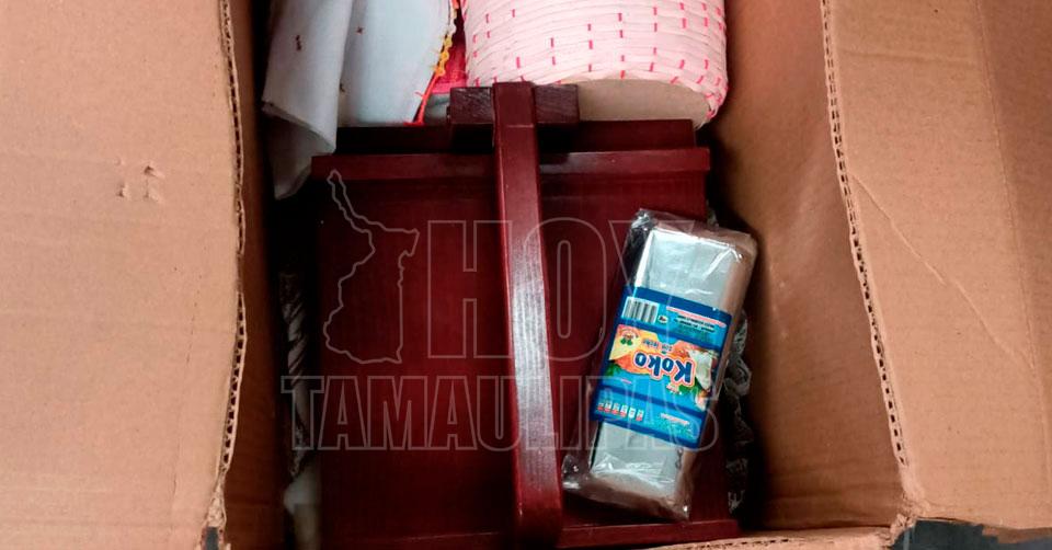 De acuerdo con el testimonio, en el paquete se visualizó una máquina de madera para hacer tortillas a mano y un tortillero de unicel, el cual contenía en su interior cinco paquetes de dulce de coco, dos servilletas blancas con estampado y material oculto, por lo que procedieron a abrir el paquete y encontraron el presunto narcótico.
