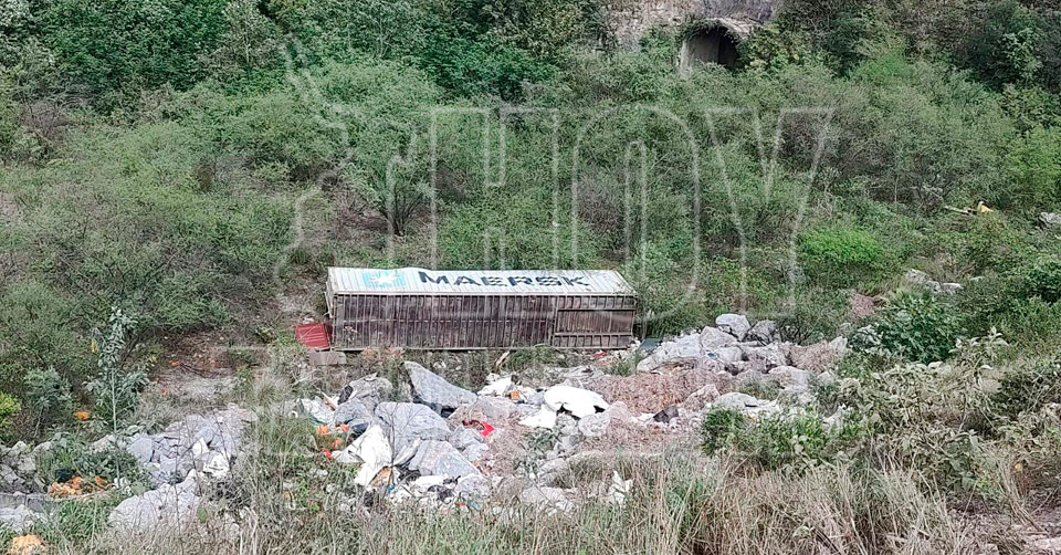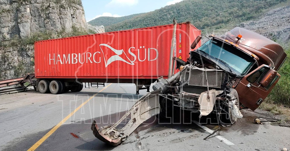 La cabina del tráiler se encuentra chocada, mientras que uno de los contenedores cayó en un barranco y otro quedó sobre la cinta asfáltica, obstruyendo la circulación.