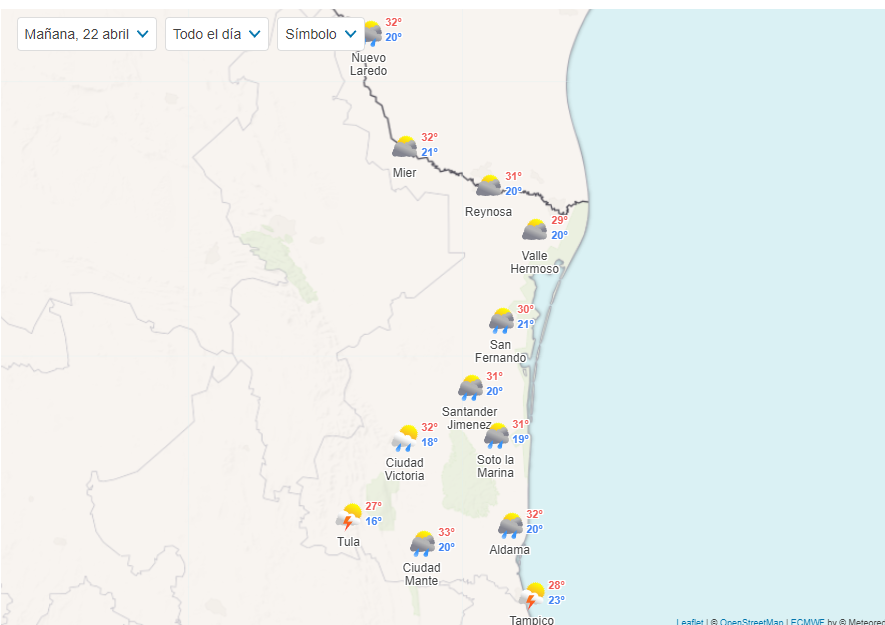 Según el pronóstico del clima para este sábado en la capital de Tamaulipas se esperan temperaturas máximas de 38 grados centígrados y mínimas de 18 con un 80 por ciento de probabilidad de que se registren lluvias mayormente por la tarde.